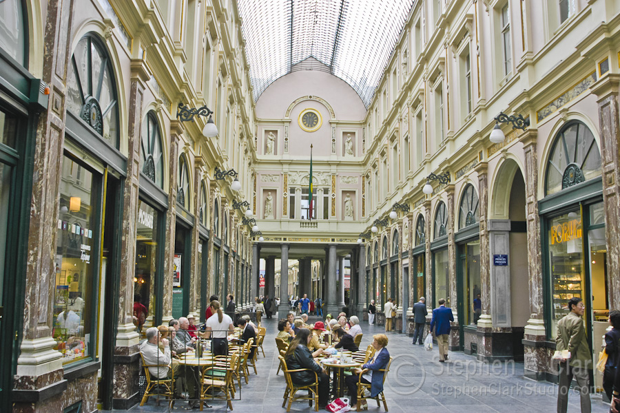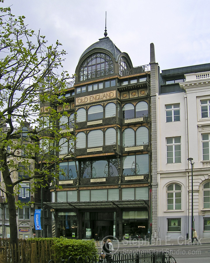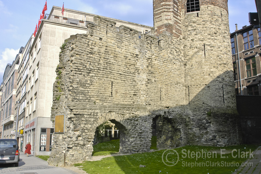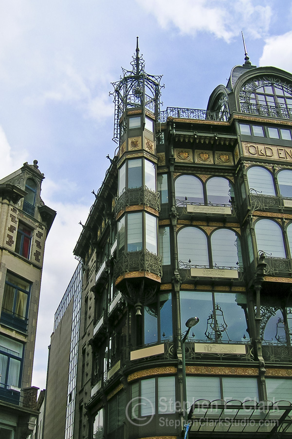 Walking back to the train station, less than a block from the Place Royale, we passed the "Old England" building on the Rue Montagne de la Cour, which looked so interesting and out of place that I took several photos. I later learned that this was once a department store by the name of Old England, built in 1899, that is now houses the Museé Instrumental. What is remarkable about it is its Art Nouveau architecture comprised of entirely of glass and wrought iron. It is considered one of the finest examples of that style. The rightmost picture is of a section of the original city wall that dates to the 11th or 12th century, somehome surviving all that time intact. It is located on the south side of the Boulevard de l'Empereur, a couple blocks south of the Central Train Station.