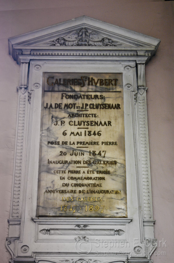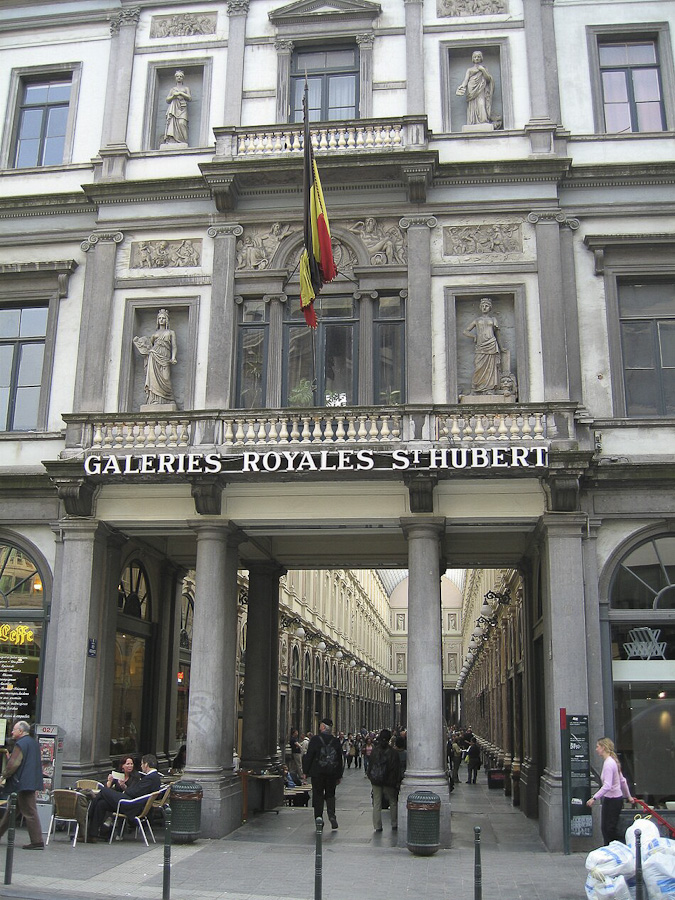 A few hundred feet further west is the Galeries Royales Saint-Hubert, one of the first covered shopping and dining arcades, inaugurated in 1847. We did some shopping, Denise bought a sun hat, and then we had a cup of tea and a light lunch before moving on. Note how the gallery bends beyond the colonnade at its center to relieve the tedium of its long, narrow perspective. (Photo of the Galeries entrance is from Le Bons Plans de Riquet, 13 April 2011).