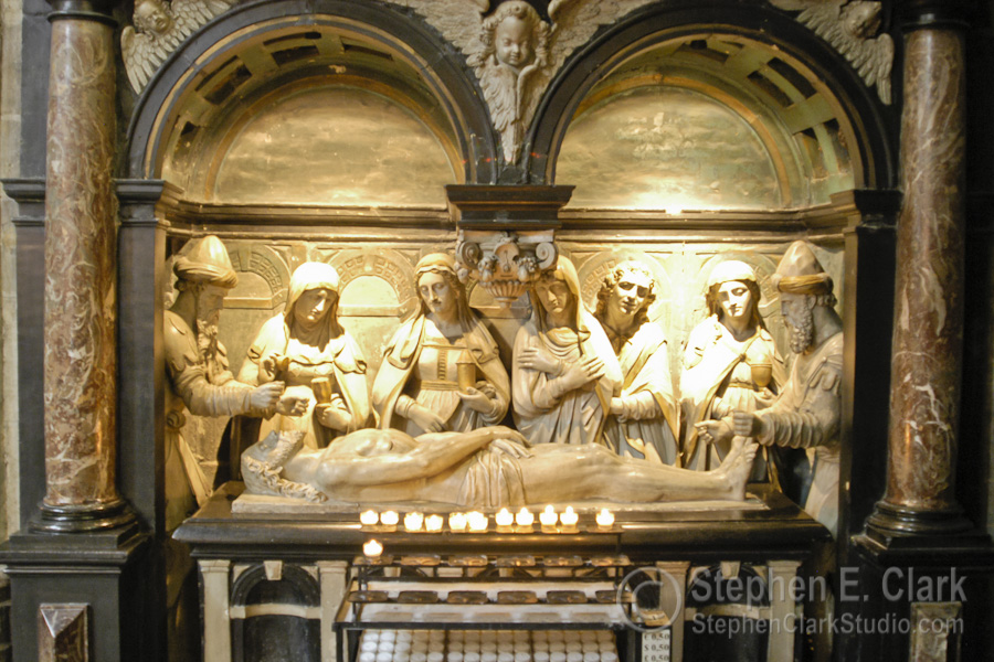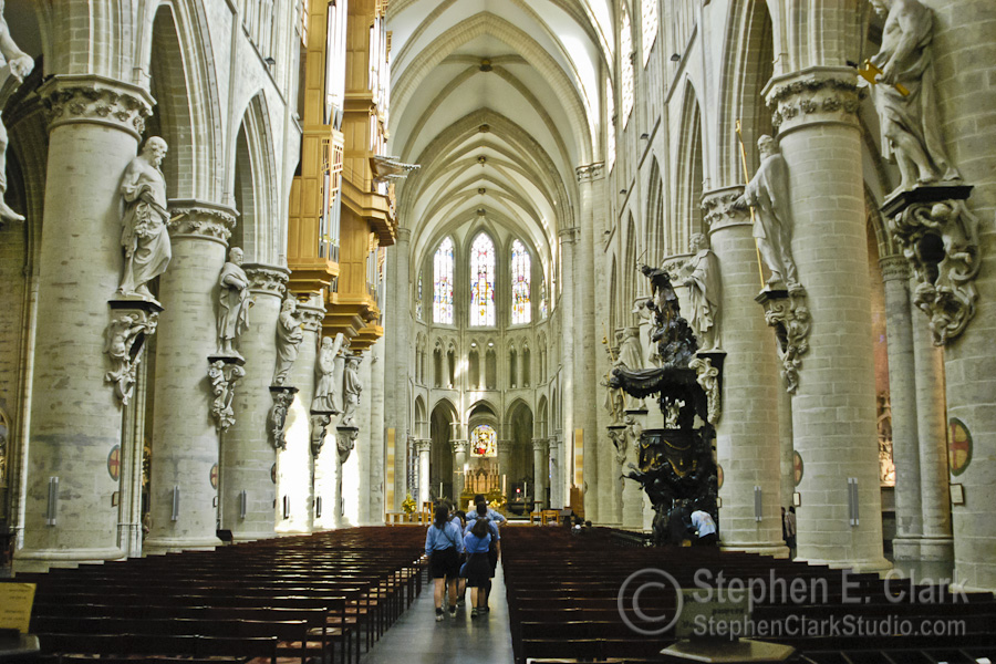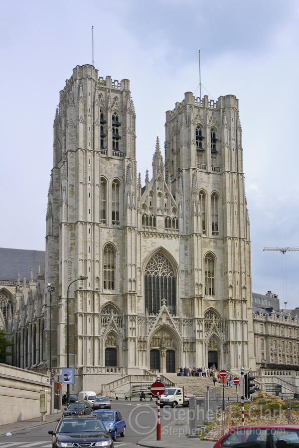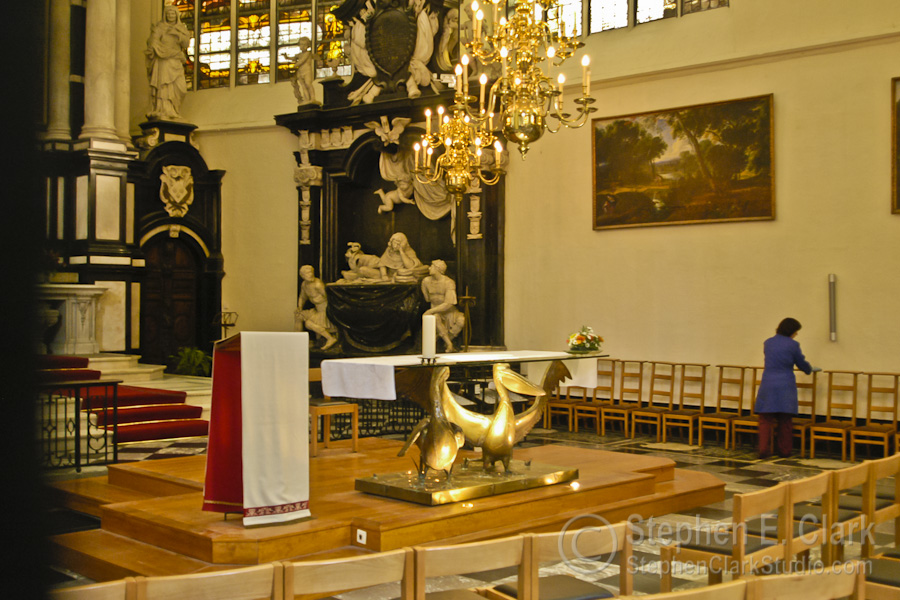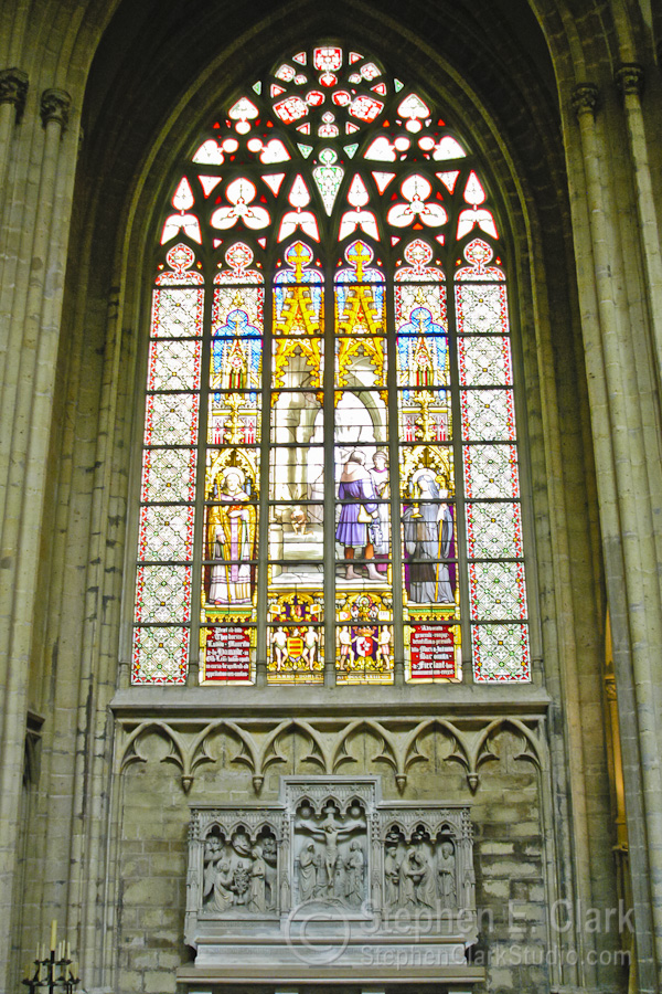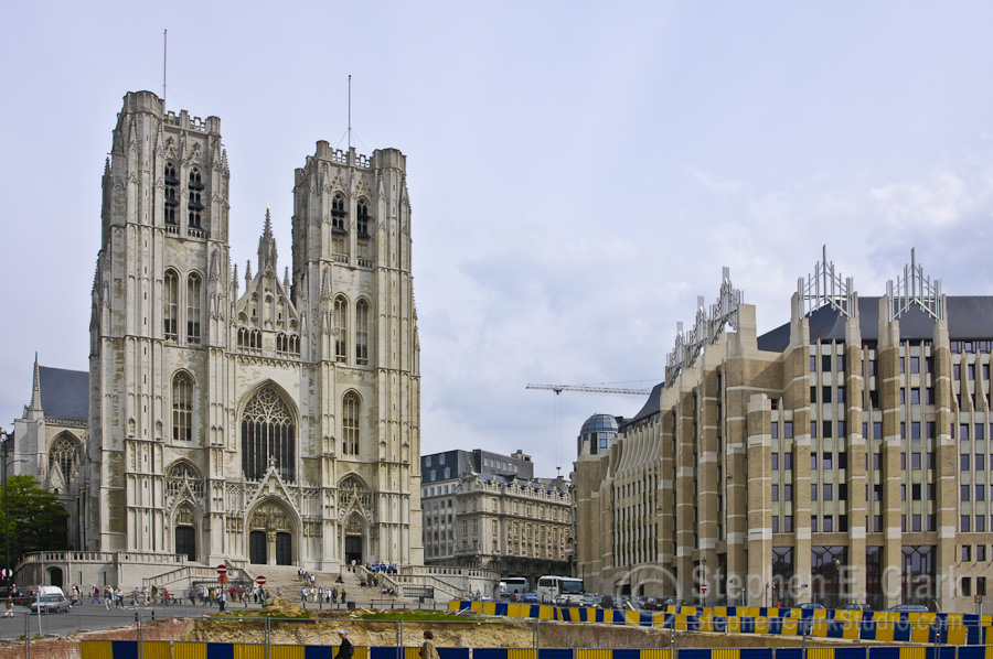 The Cathédrale des Sts-Michel-et-Gudule is the national church of Belgium and is considered the finest surviving example of Brabant Gothic architecture. Construction began in 1226 and continued for 300 years, finishing with the construction of the two front towers in the early 1600th century. The second photo looks down the central isle of the church from near the entrance. Note the gilded storks holding up the table near the lecturn. The stained glass windows were magnificent; this is from one of the transepts. The last picture juxteposes the cathedral to an adjacent office building under construction whose modern design is clearly inspired by the cathedral. I thought they looked cool side by side.