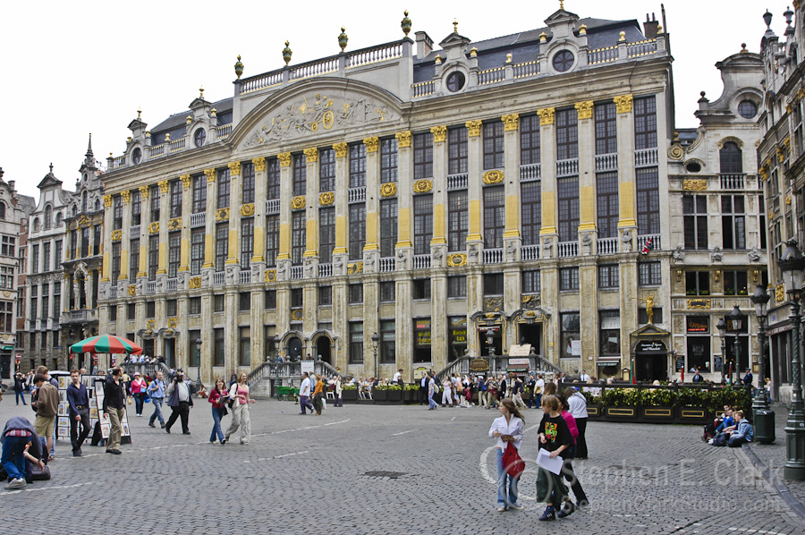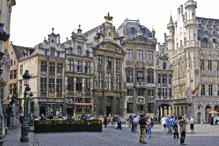 And within another few hundred feet one comes to La Grand Place, the cobblestoned medieval central market place of Brussels. The Grand Place is known for its ornate 17th century Flemish Renaissance architecture. From left to right above are a row of houses in the north-east corner of the square, La Maison des Ducs de Brabant (a group of six guild houses) in the south-east corner, a row of shops and restaurants along the south side, the towering Hôtel de Ville (the Brussels city town hall) in the south-west corner, and a row of shops and restaurants in the north-west corner.