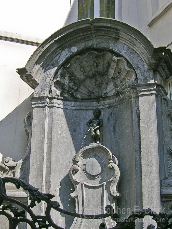 This little fellow is called the Manneken Pis and is located three blocks down the Rue de l'Étuve from the Grand Place and is apparently quite a tourist attraction judging from the crowd of people gathered about him (including ourselves). It is the statue of a young boy (only about 30 cm tall) peeing into a small pool. This statue is an 1818 reproduction of the original made in 1619, reputedly inspired by the son of a 12th century duke who was seen calmly urinating against a tree in the midst of a battle. By a tradition dating to 1698 the statue is usually dressed in the traditional garb of a country whose head of state made the costume donation. The Manneken Pis is shown in the first two photos wearing a costume donated by South Africa standing in front of its national flag. The third photo was taken on another visit at one of the rare times when the statue is not dressed. There are over 400 costumes for the Manneken Pis on display in the museum of the Hôtel de Ville.