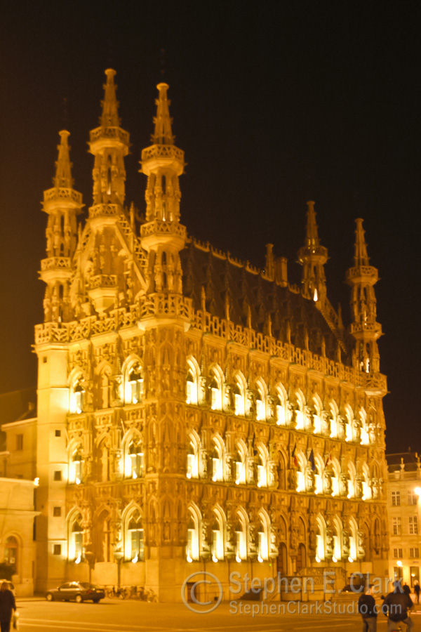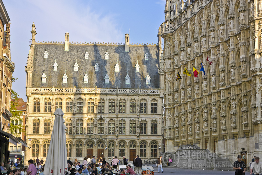 The Grote Markt is framed by Sint-Pieterskerk (Saint Peter's Church) and its fascinating clock tower and the magnificent Stadhuis (Town Hall), the latter seen here during the day and lit up at night. We enjoyed watching the gilded fellow on the church clock tower strike the bell on the quarter hour as we ate.