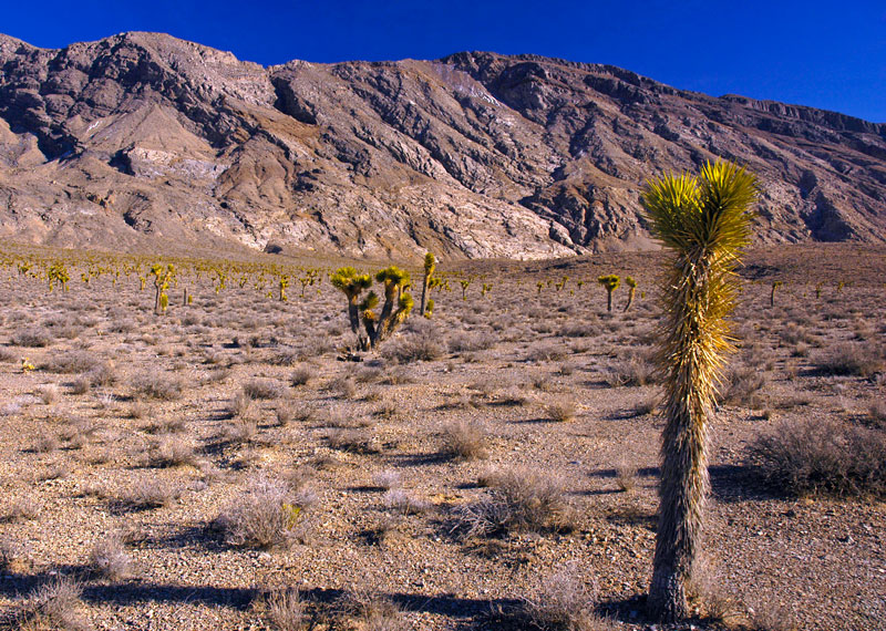 After passing Ubehebe crater, the road changed from paved to gravel and dirt; we were then on the Racetrack Valley Road. We climbed in altitude to over 4900 feet and passed through a forest of Joshua Trees. It steadily became colder, and in places there were patches of snow on the ground.