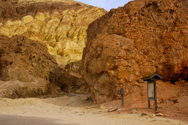 Golden Canyon: Golden Canyon is located about 2.5 miles south of Furnance Creek on the Badwater Road, and is just opposite Zabriskie Point in the Amargosa Range. In fact, one can hike to Zabriskie Point from here, about 4 miles round trip. The entrance to Golden Canyon is shown below. Like Zabriskie Point, the spectacular yellow, orange, red, and pink sedimentary rock is the major attraction, and the source of the canyon's name.