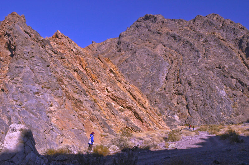 Mosaic Canyon: In the afternoon, we set off to explore Mosaic Canyon which is located off Highway 190 just west of Stovepipe Wells in the side of Tucki Mountain. Denise and our friends enter Mosaic Canyon over a broad alluvial fan in the photo below.