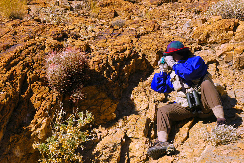 Denise takes her time to examine and photograph a barrel cactus.