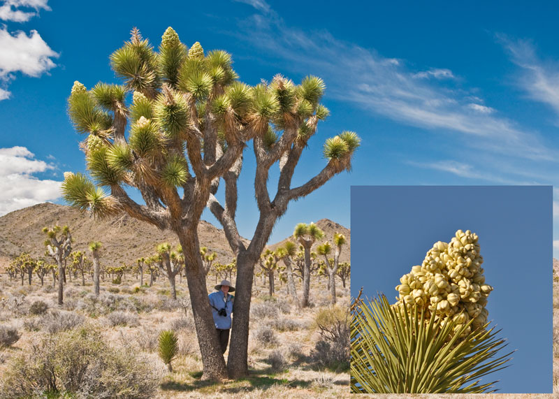 The Joshua Tree (yucca brevifolia), from which the park gets its name, is an indicator species of the Mojave Desert. By legend, it got its name from 19th century Mormon settlers who were reminded of the biblical Joshua raising his arms towards the sky in supplication. Note the yellow-white blossom panicles at the ends of some branches. A winter freeze that damages the growth end of a branch is believed to stimulate flowering, followed by branching. Thus a Joshua Tree composed of a single trunk and no branches presumably has never blossomed. The largest Joshua Tree in the park stands 40 feet tall and is believed to be 300 years old. (The detail of the blossum panicle, inset, was taken by Denise.)
