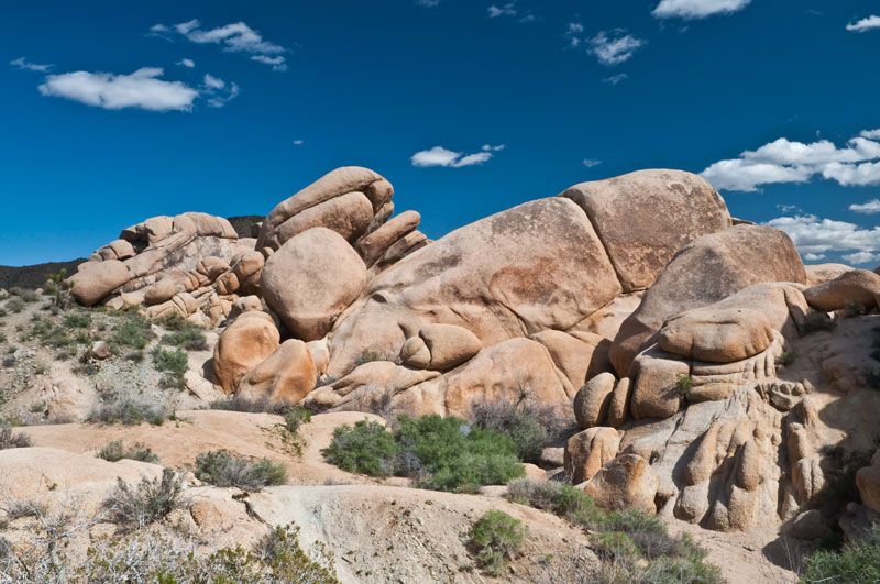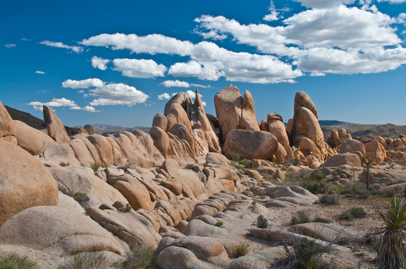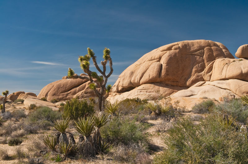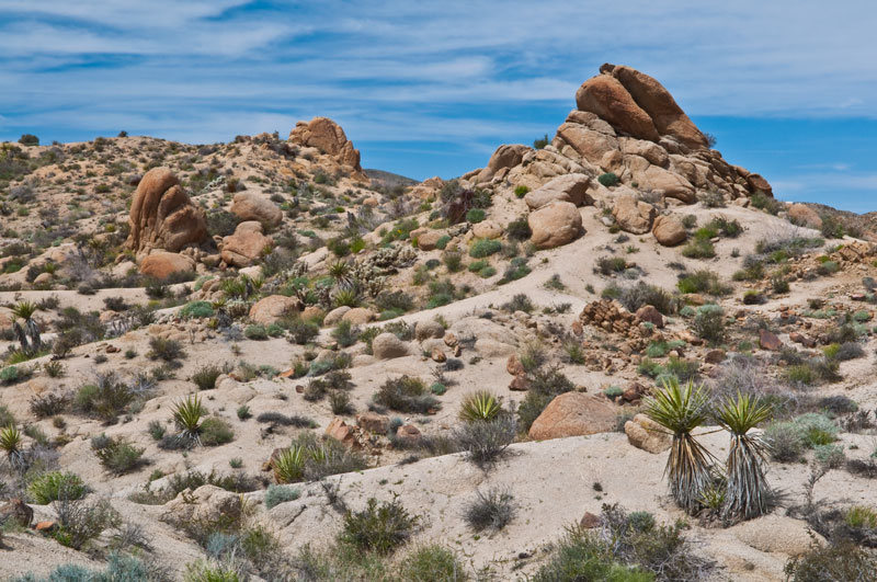 The Colorado Desert at Cottonwood Spring. The rock outcroppings are solidified plutonic lava (solidified below the surface and exposed by weathering of the surface rock) called monzogranite. In the foreground are several yucca plants and in the middle distance are numerous cholla.