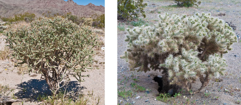 More Cholla: On the left is Pencil Cholla (opuntia arbuscula), characterized by its long thin stems, and to the right is Silver Cholla (opuntia echinocarpa), that has longer spikes and is less fuzzy in appearance than the Teady Bear Cholla. Note the burrow beneath the silver cholla plant. Some burrowing animal is cleverly using the cholla plant for protection.