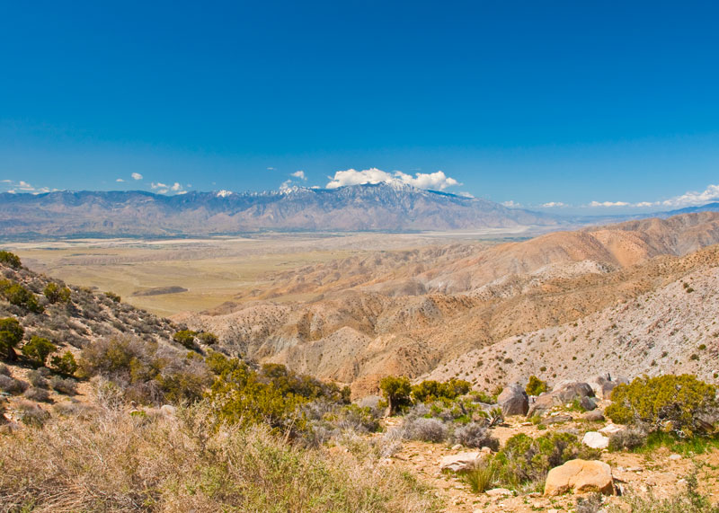 San Jacinto Peak (10,804 ft.), covered in snow, and the San Jacinto Mountains are seen from Keyes View in the Little San Bernardino Mountains that form the southwestern edge of the park. In the image below, we're looking southwest across the Coachella Valley towards Palm Springs. The low range of hills that run in a straight line east-west through the valley floor are called the Indio Hills; they mark the San Andreas fault.