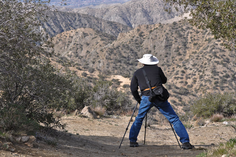 The danger of accidentally bumping into a cholla are evident in this photo of our friend Susan and me practicing the fine art of photography. The nature trail is quite narrow in some places where the cholla has overgrown it. This photo was taken by Denise.