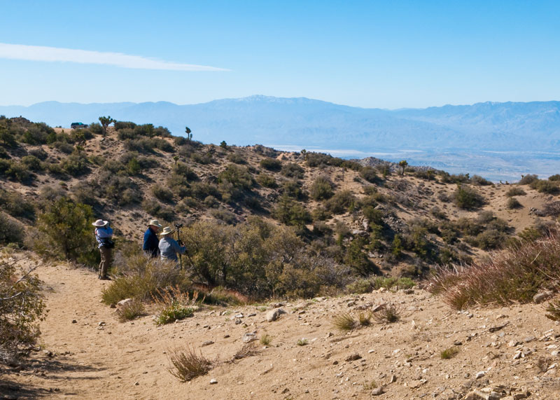 Denise, Jim and Susan discuss what next to do on Eureka Peak. In the distance to the south are the Coachella Valley, Palm Springs and Indio. Just out of view to the south is the Salton Sea. Our trusty 4-wheel drive steed awaits us in background.