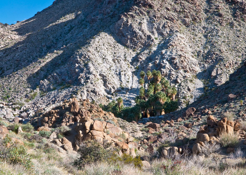 The Marine Corps Air Ground Combat Center at Twentynine Palms can just be seen to the north in the distance through the ravine from the Fortynine Palms Oasis. We heard the occasional detonation of ordnance in the distance as we hiked.