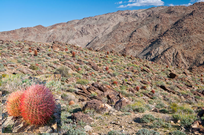 Barrel Cactus dot the landscape along the trail to the oasis. A more detailed view of the Barrel Cactus can be seen in the lower-left inset.