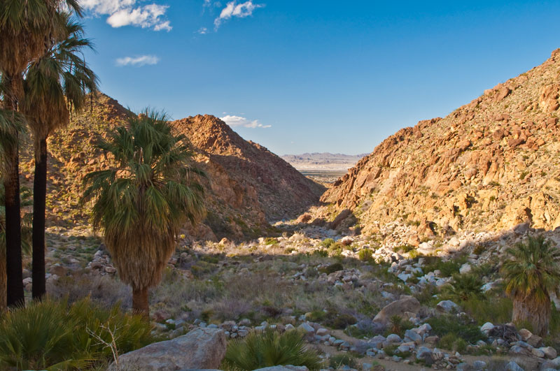 This is the Cottonwood Spring Oasis (http://www.nps.gov/jotr/planyourvisit/cottonwood.htm) located about 7 miles north of the park's south entrance near the Cottonwood Vistor Center. The oasis exists here due to a fault that allows water to seep to the surface thus sustaining the growth of dense flora. The palms are the California Fan Palm (washingtonia filifera) that can grow to 60 feet in height. Oases such as this are found in many places throughout the park and in surrounding areas, giving "palm" names to many locales, e.g. Palm Springs, Twentynine Palms, Fortynine Palms, etc. The cottonwood trees that give their name to this oasis can be seen amongst the fan palms, the bright green trees in the center-left of the photo.
