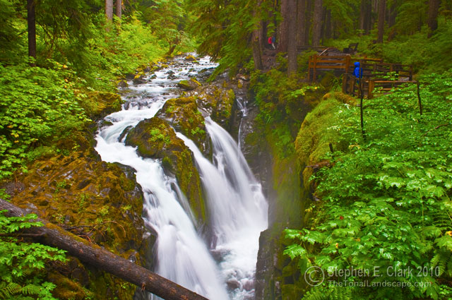 This is lower part of the Christine Falls on the Van Trump Creek. The lower part drops 37 feet below the stone bridge. The upper part of the falls (32 feet drop) is just out of site below the wooden bridge in the background.
