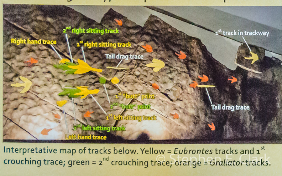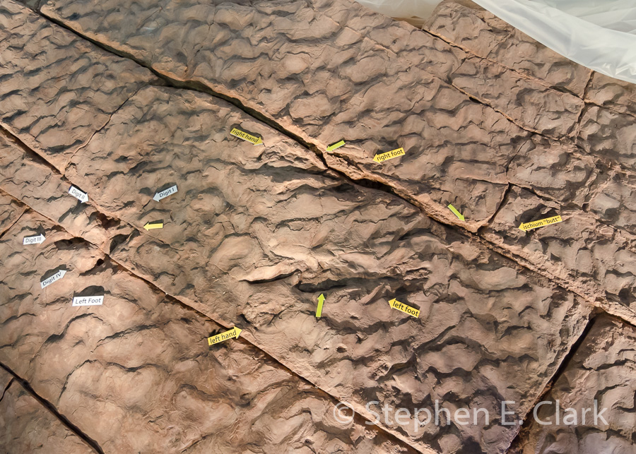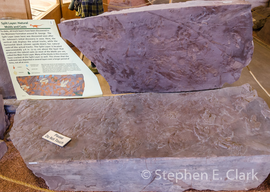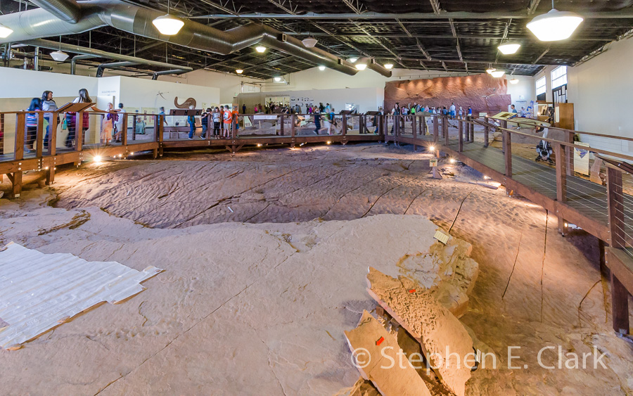The Dinosaur Discovery Site at Johnson Farm, St. George UT: This museum is unique on this trip in that its focus is on dinosaur trackways rather than dinosaur fossils, specifically the dinosaur tracks found at the Johnson Farm in 2000. The tracks date to the Early Jurassic, approximately 200 Mya, and are found in sandstone and mudstone that was once a lakeside environment, which facilitated the preservation of footprints of many species of dinosaurs, swimming claw marks, and even a very rare butt print of a sitting dinosaur. The museum building preserves a large portion of the tracks for display and study.