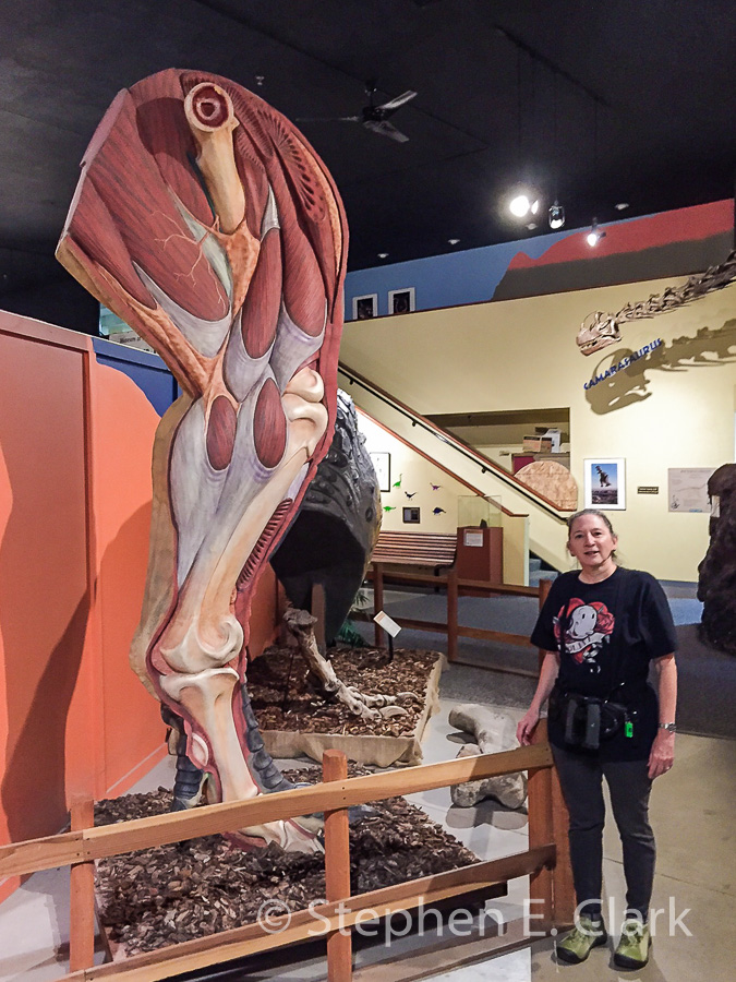 3,018 miles in two weeks, exactly. Our goal was to drive the so-called "Dinosaur Diamond National Scenic Byway" and live to tell the story. I know marketing in a name when I see it, and to some extent that proved to be true, but we did the drive and visited seven museums, including one not on the Dinosaur Diamond, devoted to the paleontology of Utah and western Colorado, with a focus on dinosaurs, their fossils and other remains. The one museum outside the Dinosaur Diamond, the Dinosaur Discovery Site at Johnson Farm in St. George, was all about dinosaur tracks. Two of the sites had dinosaur fossils in situ (still in the ground): the Dinosaur National Monument Quarry and the Cleveland-Lloyd Dinosaur Quarry. (There was a third, the Hanksville-Burpee Dinosaur Quarry, located just outside Capitol Reef National Park eleven miles northwest of Hanksville, but we didn't know about it until after the trip and and it may not have been open to the public anyway.) These and the other sites displayed their fossils, or replicas when the originals were too fragile or valuable to display, and a prodigious amount of information of what is known of the dinosaurs who lived there during the Age of Dinosaurs, the so-called Mesozoic Era from approximately 245 to 65.5 million years ago (Mya). One can assume the Better Business Bureaus of the towns we visited and stayed in while on this trip were pleased by their marketing and how it brought us there.