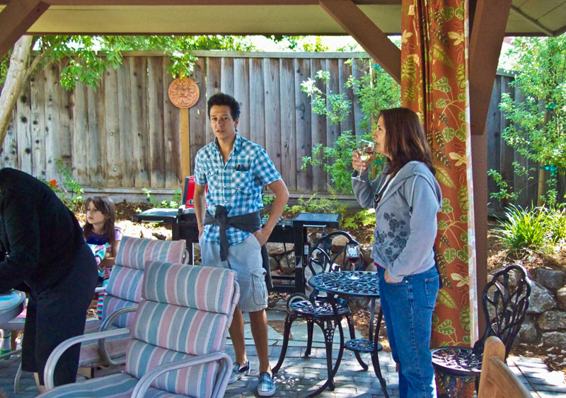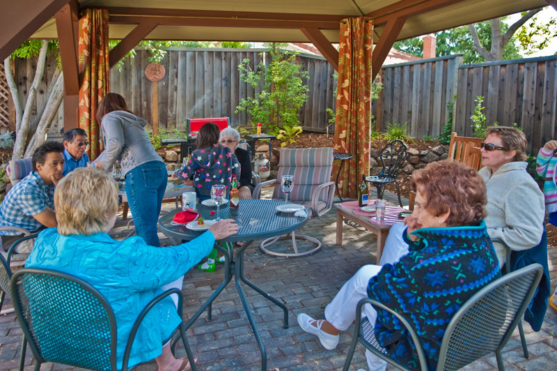 Later, more local members of the family joined us and we moved outside to eat under our backyard gazebo. Below are Denise's cousin, Carrie, and her husband, Rob. (Photo by Betty. Image processing by me.)