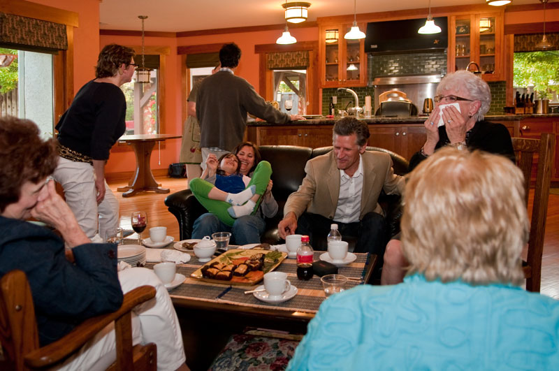Cousin Barbara and her children, Mark and Carrie (with her daughter in her lap), share a laugh with mother Annie and cousin Betty (backs to camera).