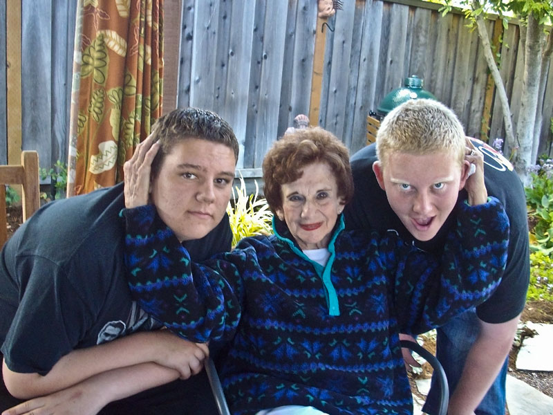 Annie poses with her grandsons, Mark and Matt. (Photo by Barbara. Image processing by me.)