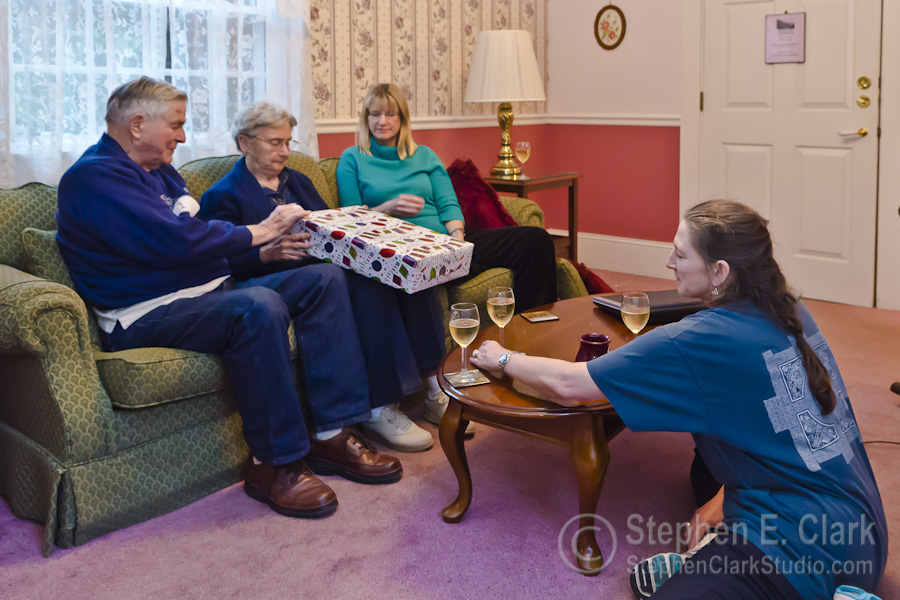 Later, we gathered in my parents' room to celebrate my Mom's 85th birthday with some cake and champagne.