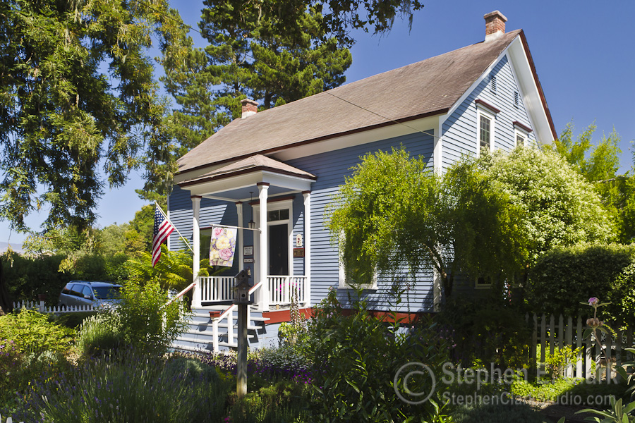 All six of us stayed at the Olallieberry Inn. The first image shows the front of the main building of the inn. The second and third photos show the back gardens and the three-room Innkeeper's Cottage where we stayed. The family gathered for a glass of wine before walking downtown for dinner. The Olallieberry Inn is located in the old part of Cambria, within easy walking distance of many shops and restaurants. Denise and my sister Sara stand in front of a gourmet cooking ship at the intersection of Main Street and Burton Drive, and in the last photo Denise and my brother-in-law Jeff wander down Burton Drive to investigate the galleries.